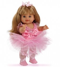Cette jolie petite poupée blonde aux yeux bleus porte une ravissante tenue de danseuse ballet avec son tutu et ses ballerines assorties.