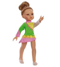 Elle porte une jolie tenue de gymnastique et est livrée avec différents accessoires: ballon, cerceau,ruban,massues.
