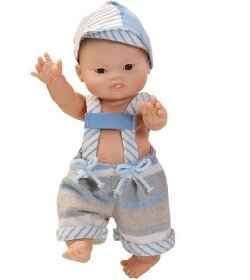 Poupon au corps dur entièrement en vynile,vêtu d'une ravissante salopette bleue avec casquette assortie .