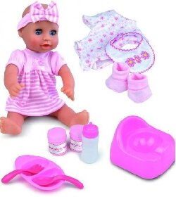 Livré avec un pot,un biberon,un ensemble repas,2 petits pots,un bavoir,des chaussons,un body.