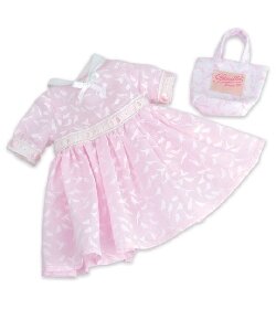 Adorable ensemble Petitcollin avec robe rose à motif hirondelles blanches et sac à main en tissu assorti pour poupées de 40 cm.