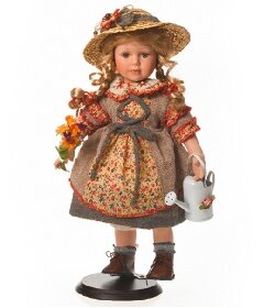 Elle porte une élégante robe avec chapeau assorti et tient un joli arrosoir en métal dans la main.